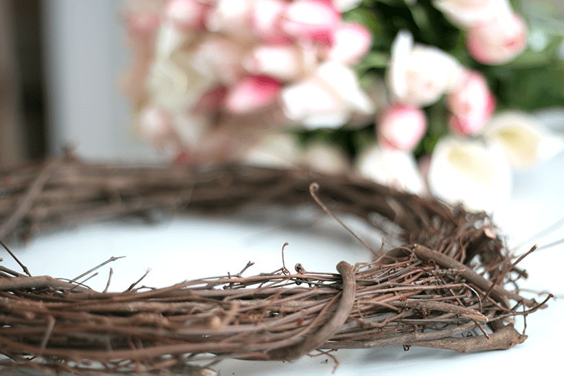 I didn’t want to cut the the stems off completely, so I trimmed the stems so they were about 6″. I intertwined the wired stem with the twigs of the wreath, so it did not require any kind of glue to hold into place.
